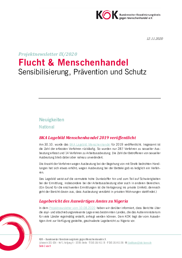 Bei Interesse an Informationen zu den Themen Menschenhandel und Ausbeutung empfehlen wir Ihnen, den vierteljährlichen Newsletter des KOK zu abbonieren >>mehr