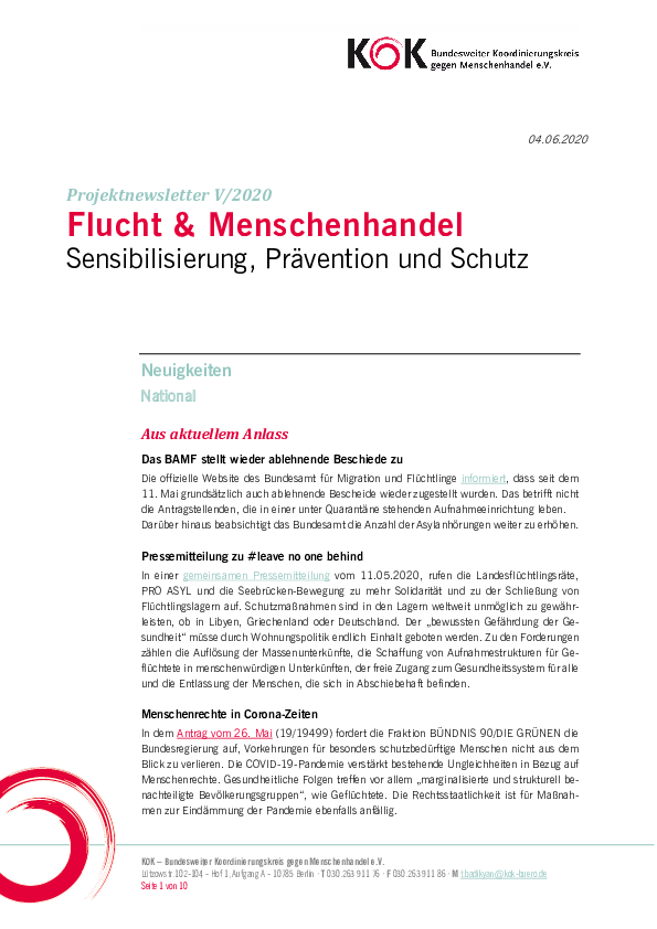 Der KOK-Projektnewsletter "Flucht & Menschenhandel" für den Monat Mai ist erschienen.