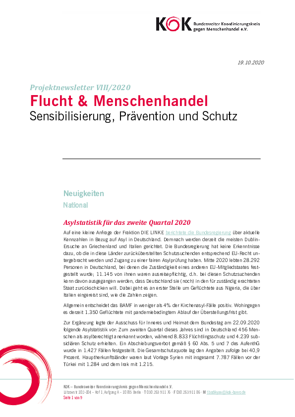 Der KOK-Projektnewsletter "Flucht & Menschenhandel" für die Monate August und September ist erschienen.