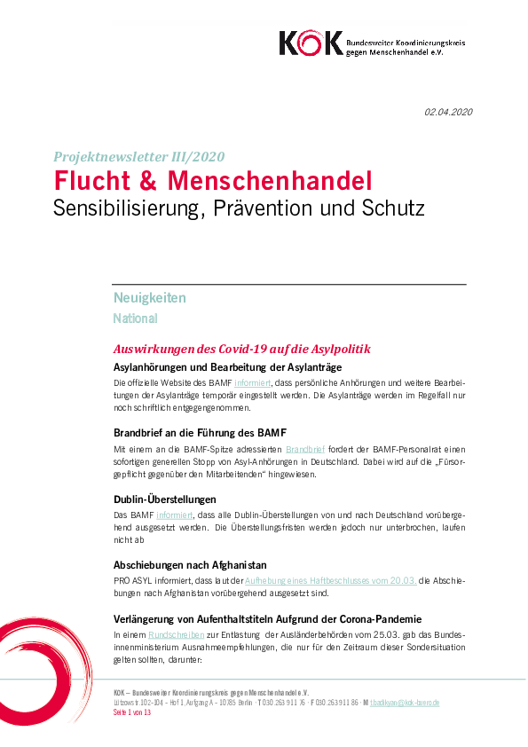 Der KOK-Projektnewsletter "Flucht & Menschenhandel" für den Monat April ist erschienen.