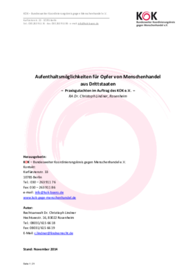 Rechtsanwalt Dr. Lindner erstellte im Auftrag des KOK ein Praxisgutachten zum Thema Menschenhandelsbetroffene aus Drittstaaten und Aufenthaltsmöglichkeiten nach dem Aufenthaltsgesetz oder im Rahmen des Asylverfahrens.