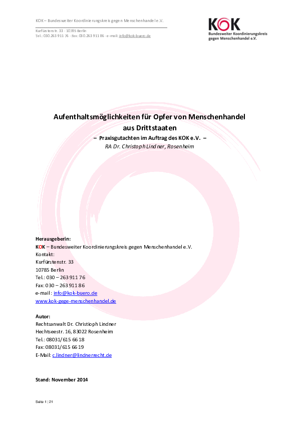 Rechtsanwalt Dr. Lindner erstellte im Auftrag des KOK ein Praxisgutachten zum Thema Menschenhandelsbetroffene aus Drittstaaten und Aufenthaltsmöglichkeiten nach dem Aufenthaltsgesetz oder im Rahmen des Asylverfahrens.