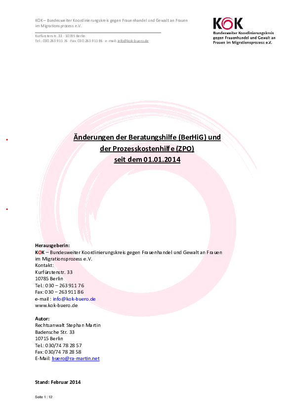 Der KOK hat eine Handreichung zu den seit 01.01.2014 geltenden Änderungen der PKH und Beratungshilfe in Auftrag gegeben.