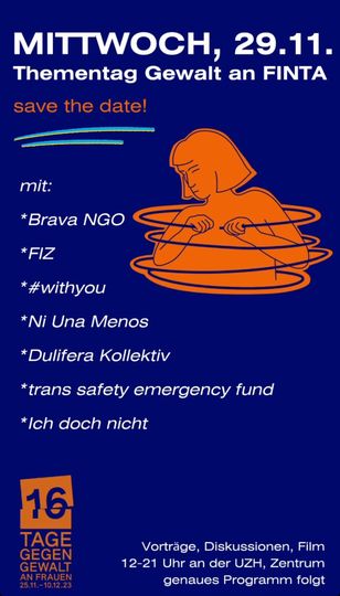 Im Rahmen der 16 Tage gegen Gewalt an Frauen* in der Schweiz, bietet die Fachstelle Frauenhandel und Frauenmigration (FIZ) ein Online-Basismodul mit einem Fokus auf psychischer Gewalt an. Nähere Informationen sind hier aufzufinden. Außerdem verteilt die FIZ am 28. November zwischen 08.00 und 09.00 Uhr Postkarten am Bhf. Altstetten in Zürich. Auch dazu sind weitere Details hier abrufbar. Den darauf folgenden Tag hält die FIZ im Rahmen einer Vortragsreihe des Feministischen Hochschulkollektivs einen Vortrag an der Universität Zürich. Der dazugehörige Flyer ist unterhalb des Textes abrufbar.