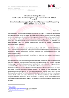 Der jetzt vorliegende Entwurf eines Gesetzes gegen illegale Beschäftigung und Sozialleistungsbetrug enthält in der Gesetzesbegründung deutliche Klarstellungen in Bezug auf Menschenhandel, die der KOK in seiner aktualisierten Stellungnahme vom 01.04.2019 ausdrücklich begrüßt.