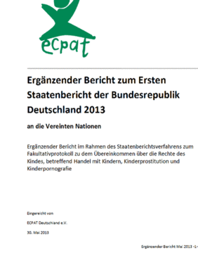 Die Arbeitsgemeinschaft zum Schutz der Kinder vor sexueller Ausbeutung (ECPAT Deutschland e.V.) hat in Kooperation mit dem KOK e.V. und anderen Nichtregierungsorganisationen einen ergänzenden Bericht zum „Fakultativprotokoll zu dem Übereinkommen über die Rechte des Kindes, betreffend Handel mit Kindern, Kinderprostitution und Kinderpornografie“ (OPSC) verfasst. Darin weist sie auf die Mängel und Lücken des Ersten Staatenberichts der Bundesregierung hin, der im April 2013 bei der UN-Kinderrechts-Kommission eingereicht wurde und die Umsetzung der im Protokoll vorgesehenen Maßnahmen in Deutschland dokumentiert. ECPAT kritisiert, dass der Bericht der Bundesregierung nicht hinreichend auf die im Protokoll enthaltenen Vorgaben zur Strafverfolgung und zum Opferschutz eingehe und an vielen Stellen unpräzise und verallgemeinernde Beschreibungen enthalte. Der vollständige Bericht von ECPAT kann hier eingesehen werden.