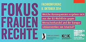Gemeinsam mit der Friedrich Ebert Stiftung und Terre des Femmes veranstaltet der KOK am 08.10. die Fachveranstaltung "Fokus Frauenrechte: Welche Konsequenzen ergeben sich aus der EU-Richtlinie gegen Menschenhandel und der Europaratskonvention von Istanbul?"