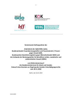 Wir begrüßen die im Gesetz enthaltenen deutlichen Verbesserungen z.B. insbesondere die Aufnahme einer Vermutungsregel, die geplante Aufnahme psychischer Gewalt, Menschenhandel und Stalking in die Entschädigungstatbestände, die vollständige Gleichstellung ausländischer Staatsangehöriger mit deutschen Betroffenen und der erleichterte Zugang zur psychotherapeutischen Versorgung über Trauma-Ambulanzen (ausführliche Stellungnahme vom KOK, ado, bff und VBRG hier.)
