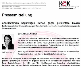 „Die nach dem Vorbild der ‚Transitzentren‘ in Bayern geplanten Unterkünfte setzen vor allem auf Rückführung und Isolation statt auf Schutz und Integration von Geflüchteten“, kritisiert Dr. Monika Hauser, Gründerin der Frauenrechtsorganisation medica mondiale in einer gemeinsamen Pressemitteilung mit dem Bundesweiten Koordinierungskreis gegen Menschenhandel – KOK e.V.