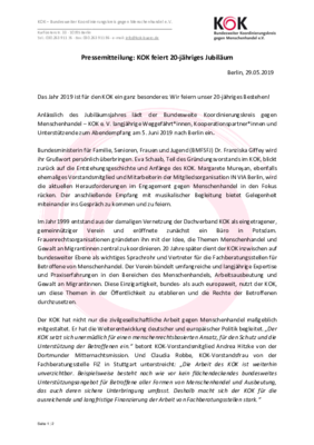 Anlässlich des Jubiläumsjahres lädt der Bundesweite Koordinierungskreis gegen Menschenhandel – KOK e. V. langjährige Weggefährt*innen, Kooperationspartner*innen und Unterstützende zum Abendempfang am 5. Juni 2019 nach Berlin ein.