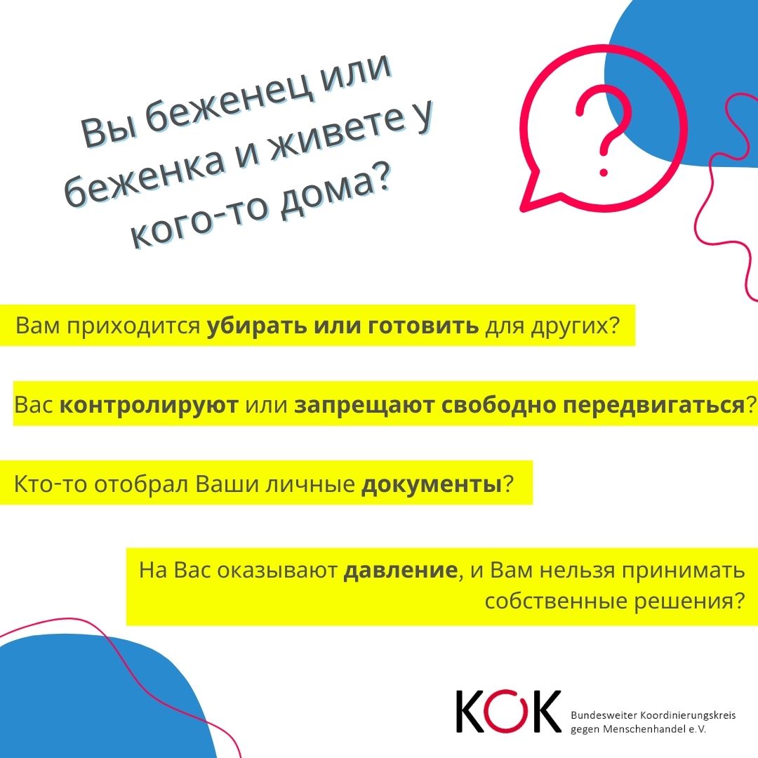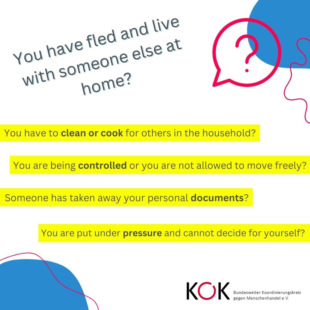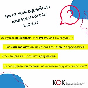 Humanitäre Krisen und Kriege machen Menschen vulnerabler für Ausbeutung und Menschenhandel. Der KOK – Bundesweiter Koordinierungskreis gegen Menschenhandel e.V. hat deswegen im Rahmen des Projektes zur Sensibilisierung, Prävention und Stärkung von Kooperationsstrukturen für Betroffene von Menschenhandel insbesondere mit Blick auf Geflüchtete aus der Ukraine spezialisierte Fachberatungsstellen für Betroffene von Menschenhandel befragt und deren Erfahrungen zu Risiken bei privater Unterbringung gesammelt.