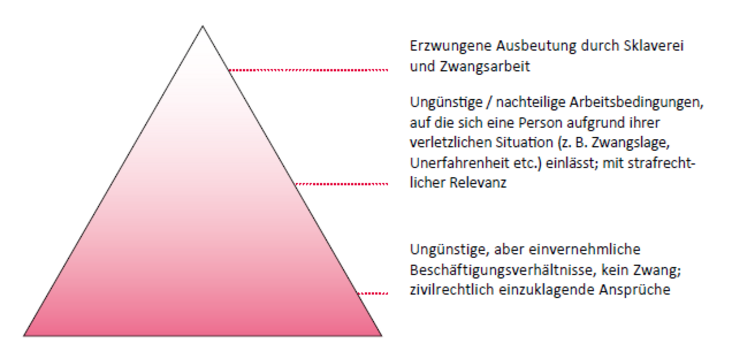 Die Übergänge zwischen ungünstigen und schlechten Arbeitsbedingungen und Arbeitsausbeutung sind oft fließend. Manchmal verschärft sich ein eingangs »nur« ungünstiges Arbeitsverhältnis im Laufe der Zeit derart, dass Arbeitsausbeutung oder sogar Ausbeutung unter Freiheitsberaubung vorliegt. Die Grafik verdeutlicht die verschiedenen Ausprägungen von ungünstigen Arbeitsverhältnissen bis hin zu Arbeitsausbeutung unter Zwang.