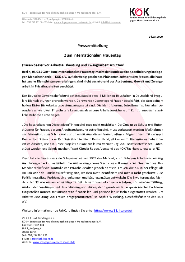 Anlässlich des internationalen Frauentags am 8. März fordert der Bundesweite Koordinierungskreis gegen Menschenhandel – KOK e.V. wirksamere Unterstützung für Frauen*, die von Menschenhandel betroffen sind. Der KOK…