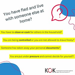Humanitäre Krisen und Kriege machen Menschen vulnerabler für Ausbeutung und Menschenhandel. Der KOK hat spezialisierte Fachberatungsstellen für Betroffene von Menschenhandel befragt und deren Erfahrungen zu Risiken bei privater Unterbringung gesammelt.